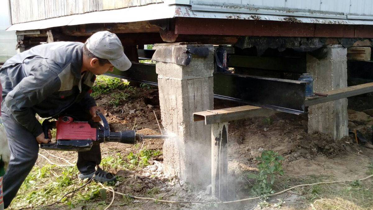 Здание приподнимают домкратами, старый фундамент разбирают. Затем по периметру дома вкручивают винтовые столбы и обрезаю их по одной высоте. В полость свай заливают бетонный раствор, на верхушки устанавливаю оголовки, делают обвязку при помощи двутавровых балок и швеллеров. Затем дом опускают. В отличие от других способов, ремонт фундамента винтовыми сваями не требует спецтехники, а срок работ не превышает двух дней.