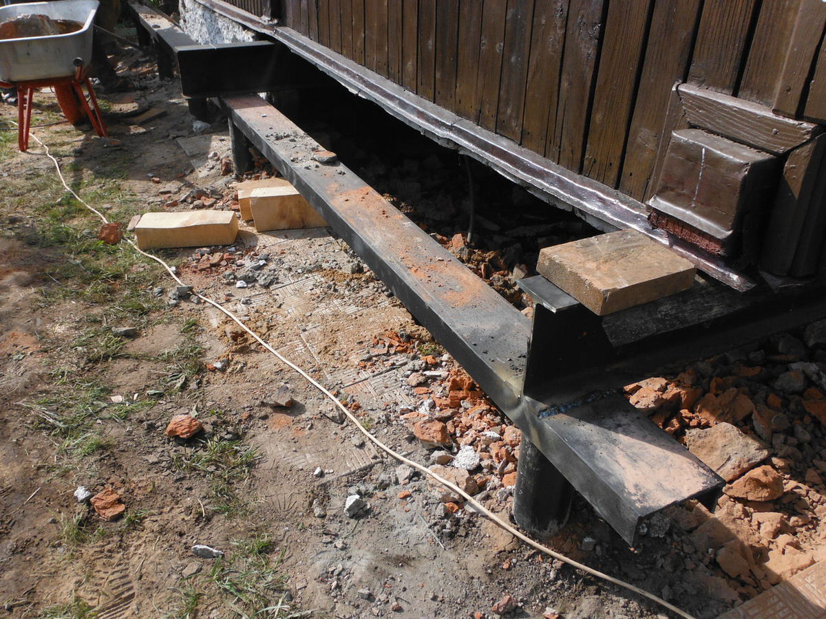 Под раскопанный фундамент помещают бетонную балку, приваривают к ней вертикальную арматура. Свободную площадь заливают бетоном. После застывания раствора устанавливают консоль, на арматуру завинчивают гайки. Таким образом часть нагрузки переходит на железобетонную обойму, препятствуя проседанию и разрушению фундамента. Этот способ ремонта требует специально оборудованной площадки и ожидания застывания бетона, что по времени сопоставимо с заливкой нового фундамента.
